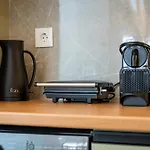 Eine Küchenzeile mit einem Wasserkocher, einem Kühlschrank und Küchenutensilien gehört zur Ausstattung der Ferienwohnung Aram'S Port House für Selbstversorger. Die nächstgelegene Bushaltestelle Definia befindet sich in unmittelbarer Nähe von der Unterkunft.
